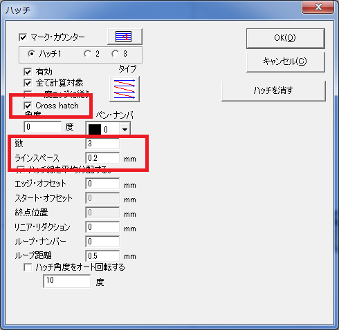 最初は文字設定は、ハッチ処理でライン数3、ラインピッチ0.2としてみました。